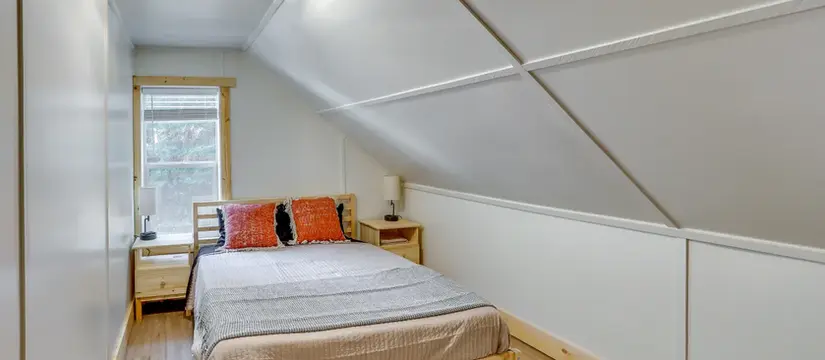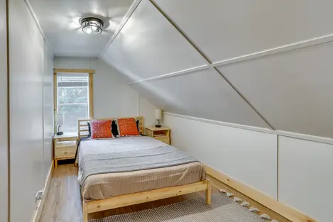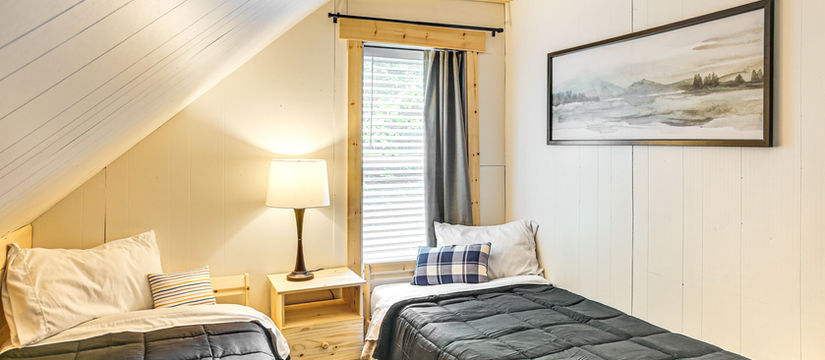 This cabin is the largest of them all. With 1500 square feet with an upstairs that consists of three bedrooms, two of them queen beds and the other side by side twins, sleeping six total. The loft offers both a play space for kids and a work space adults. The main floor features an open concept, great for gatherings, and a spacious mudroom for all your gear. The bathroom consists of plentiful linens, lots of hooks to hang them, and a vanity with enough counter space for all.
